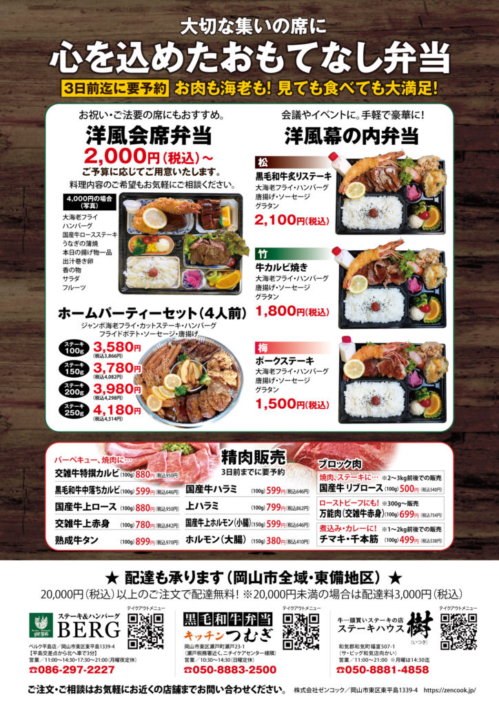 ステーキハウス樹自慢のお肉たっぷりのお弁当をぜひ!よろしくお願いいたします。